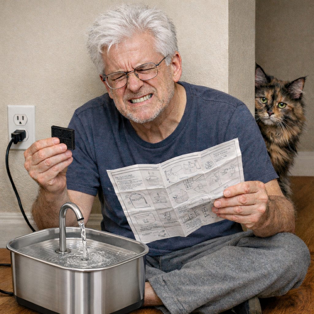 These thoughts raced through my head as I thought I’d clean and reassemble my cat’s drinking fountain. I had been successful twice previously, working all by myself.